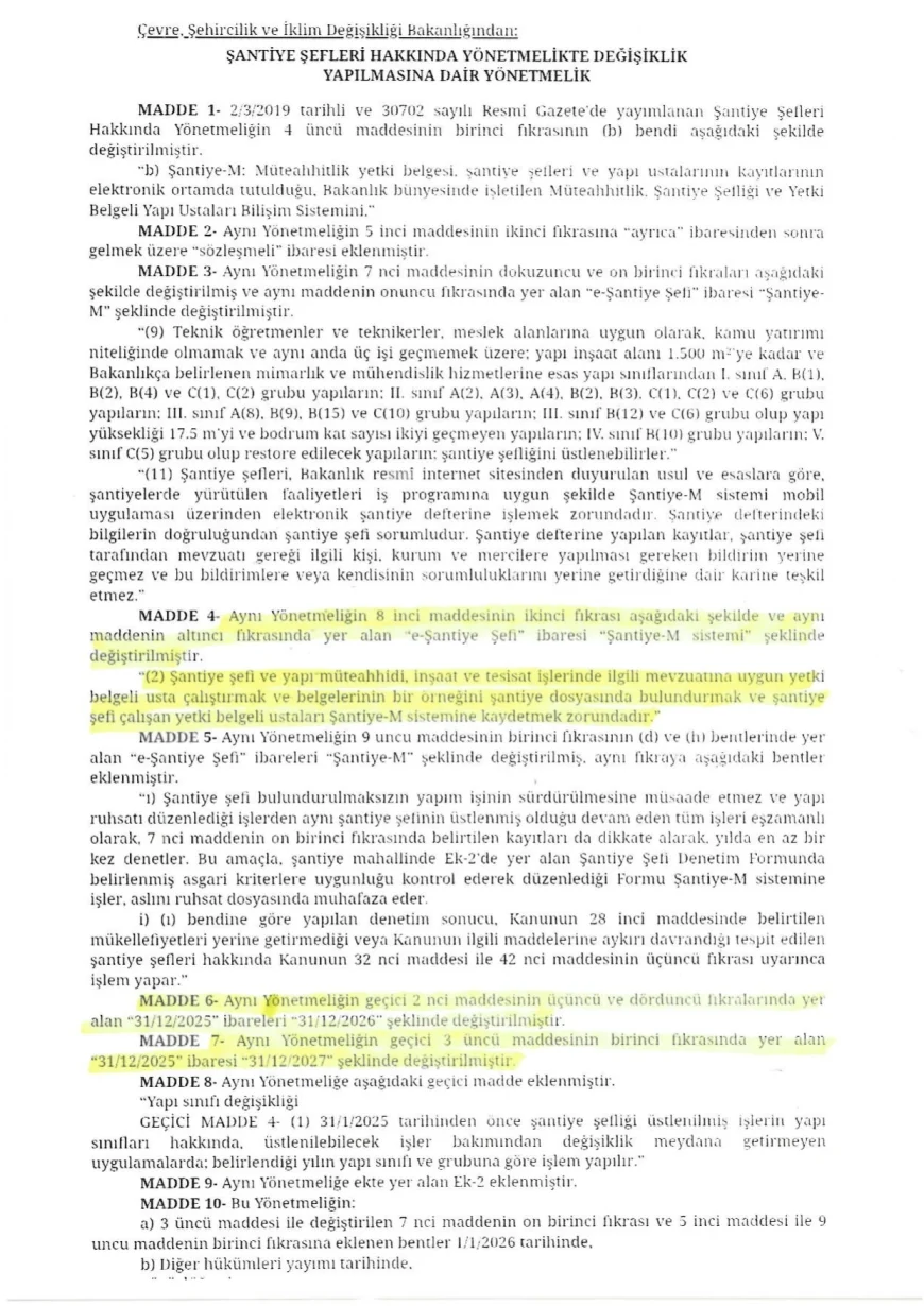01.01.2026 tarihinden itibaren şantiye şeflerinin görev, yetki ve sorumlulukları Yönetmelik ekli listedeki 4, 6 ve 7. maddeler kapsamında uygulanacaktır.